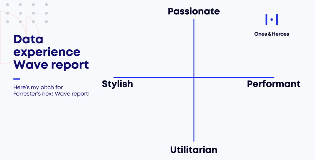 Being a consultancy, Ones & Heroes™ has the advantage of getting that human connection up-front as a matter of course. Still, I see a lot of our passion for data experiences reflected in Superhuman’s experience with email. We want people to think, “damn – there isn’t another business on the face of this planet who cares more about how much I love my data or will go as far as they will to make it happen!” When Foresters launches their new Wave report for “data experience”, I’m hoping it looks something like this: